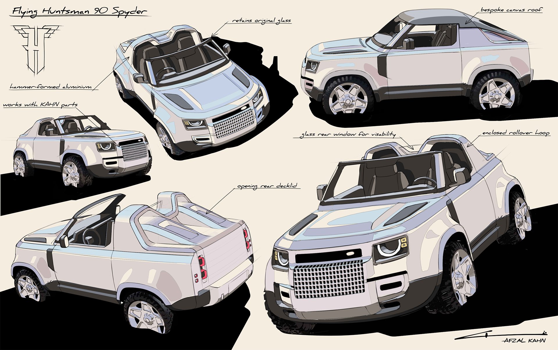 Flying Huntsman, the coachbuilding arm of the KAHN® empire responsible for the Vengeance and infamous Defender projects including the 6x6, Longnose and Homage II, have today launched their latest project, the Flying Huntsman 90 Spyder, based on the current Land Rover Defender platform.