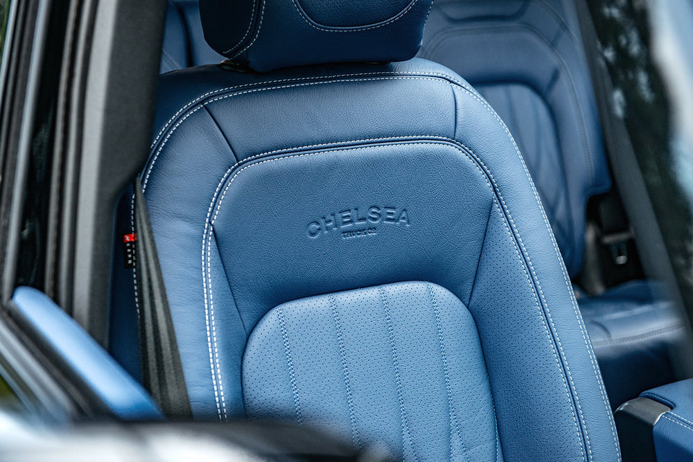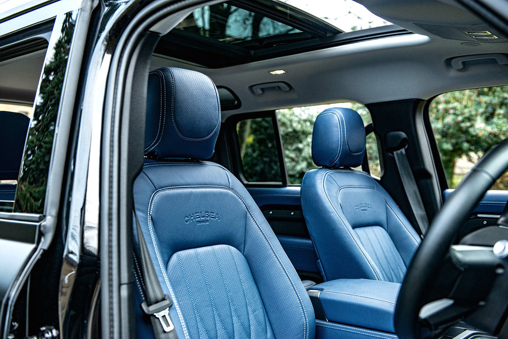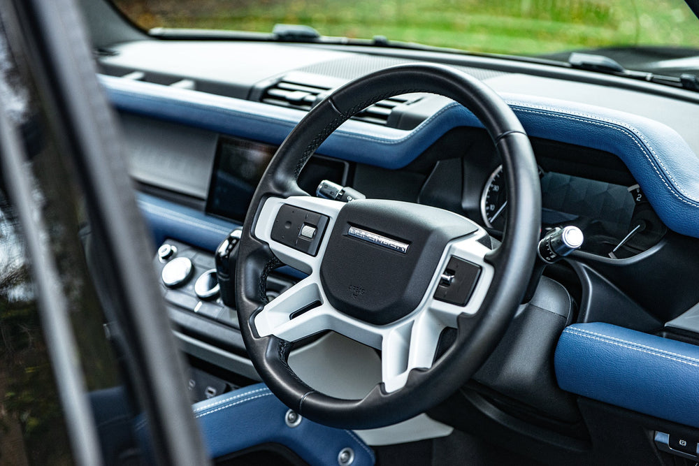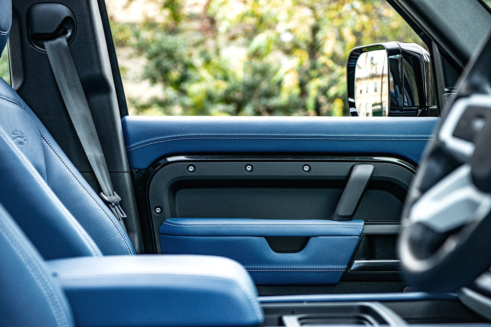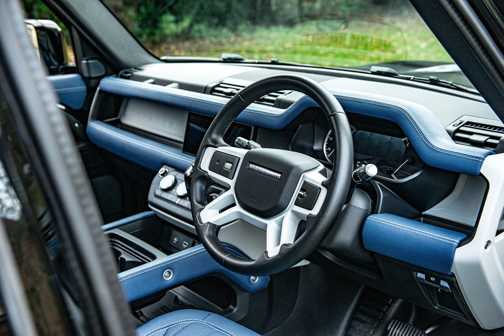Experience unparalleled luxury with the blue leather interior of the Land Rover Defender 110. Enhance your driving experience with style and comfort. Explore now with Kahn's meticulously crafted leather interior.