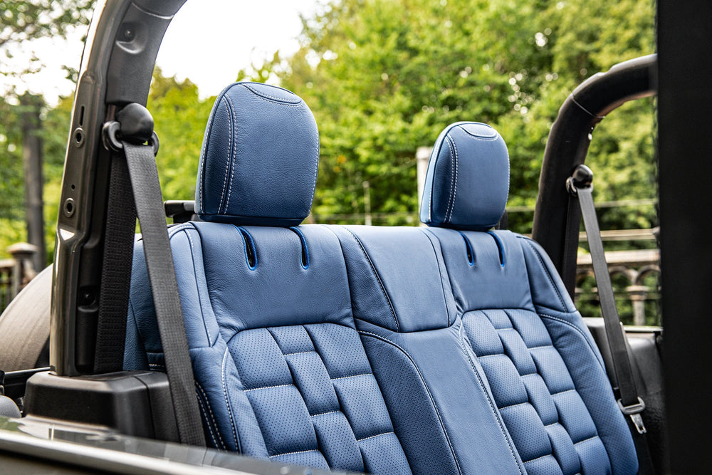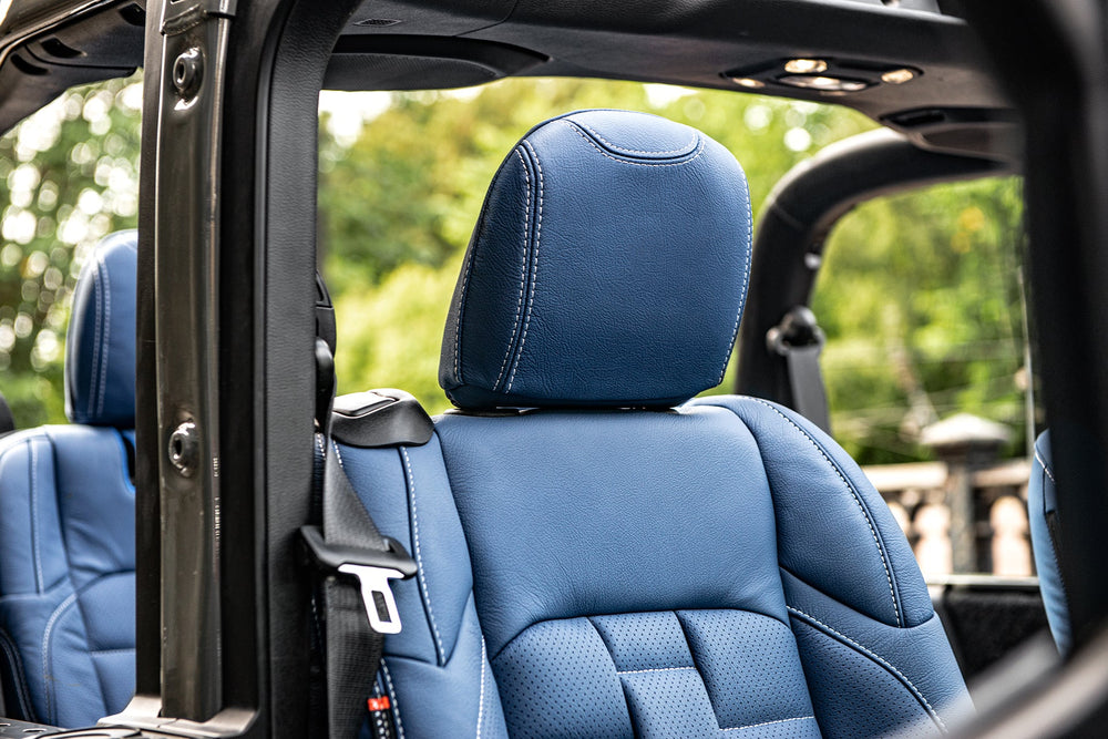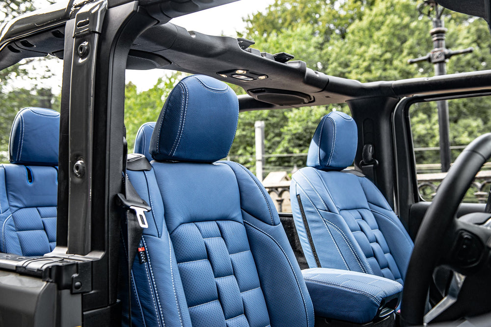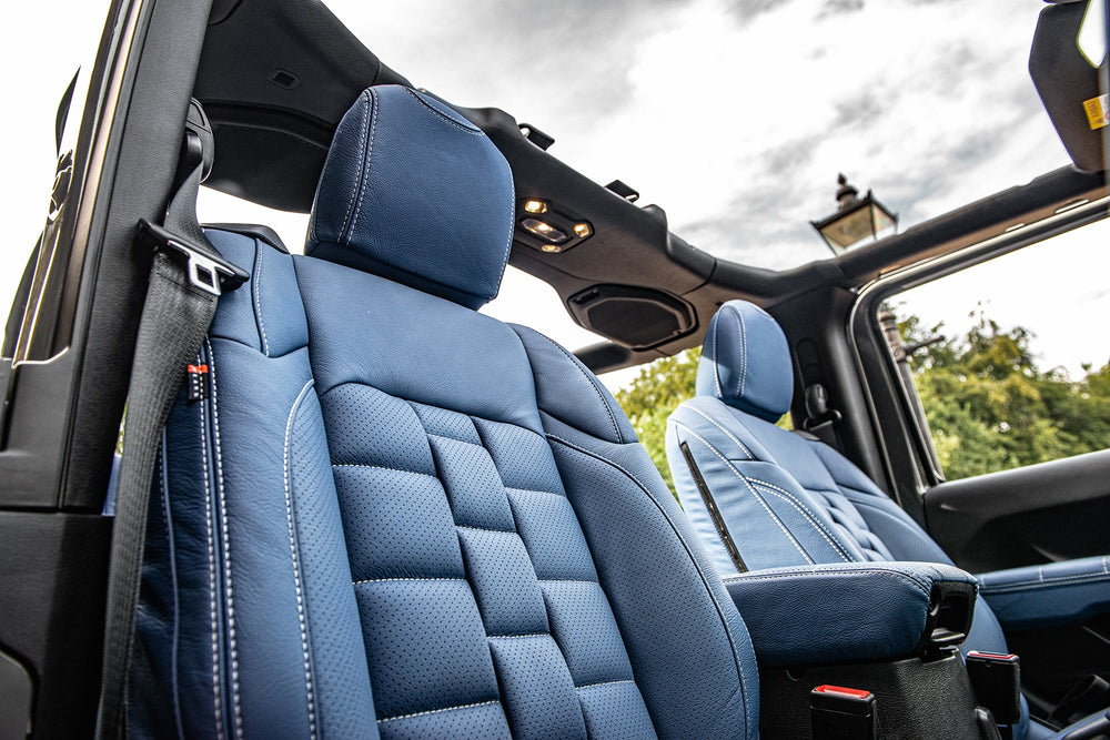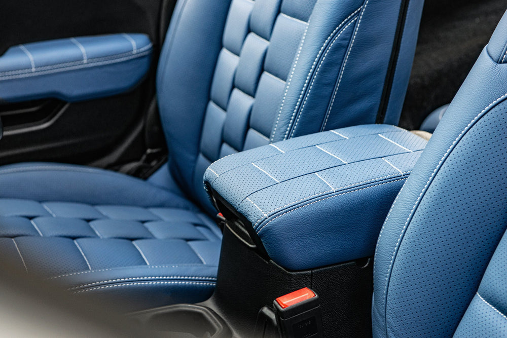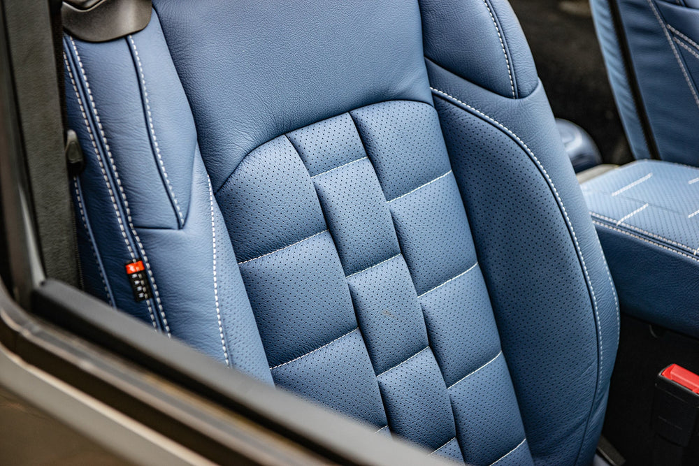 Brighten up your surroundings with the quilted and perforated leather interior that is reupholstered in a 3D herringbone design and comes in blue.