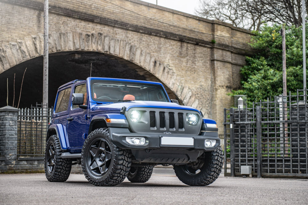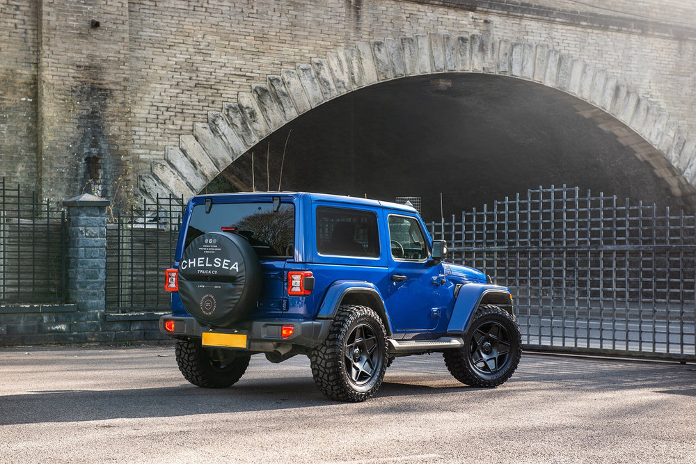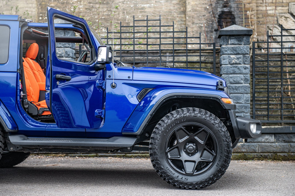 As blue as the sky, become one with the open road in the open top Targa style roof on the Chelsea Truck Company Jeep Wrangler. Light your inner fire with the magnificent orange leather interior.