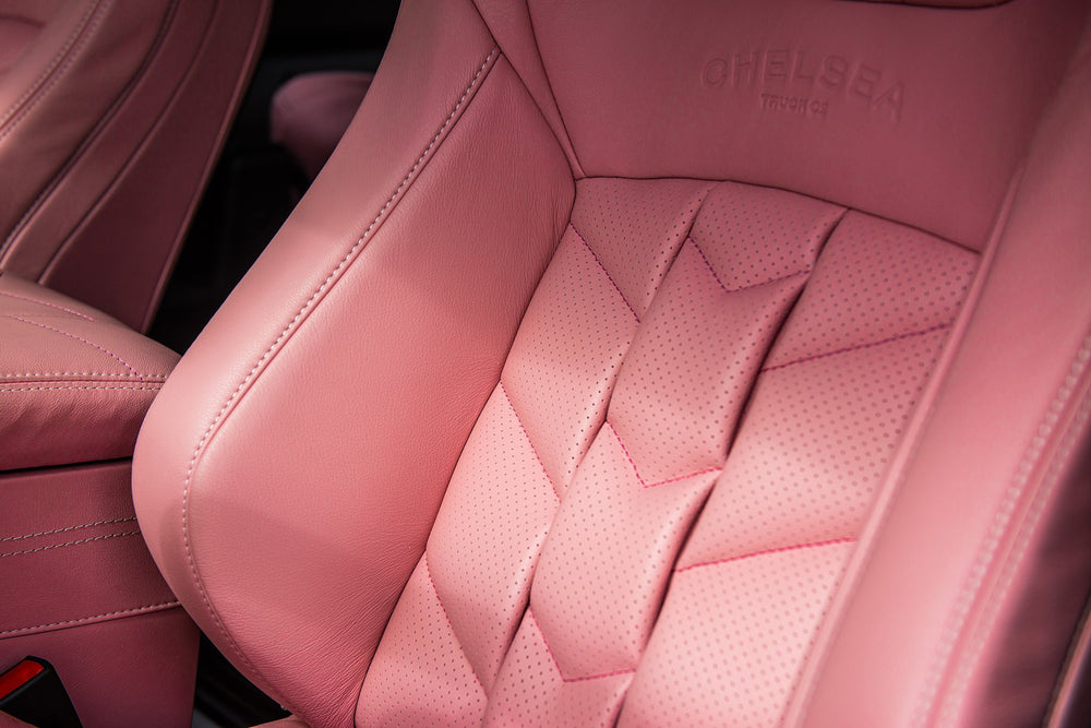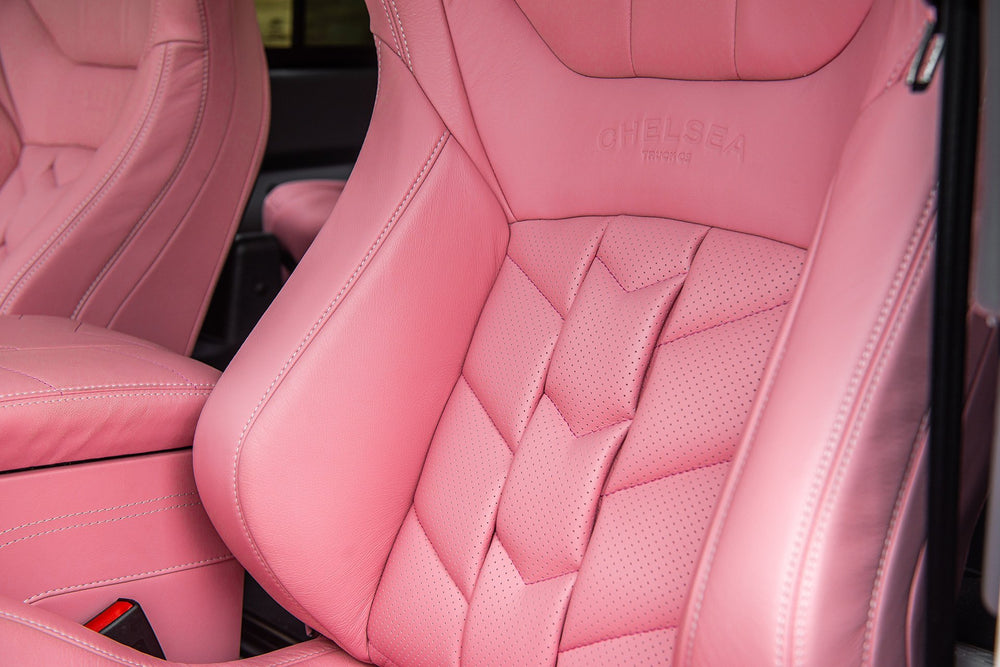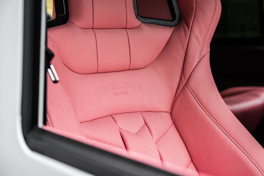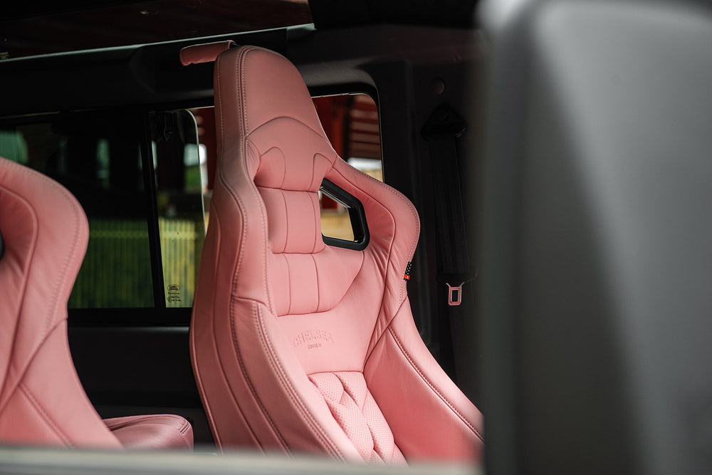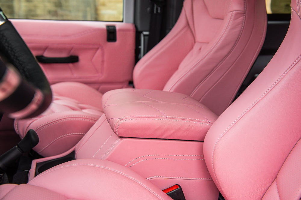 Think pink! This Land Rover Defender 90 Wide Body comes with a vibrant pink interior, a place of opulent beauty tempered by an aura of style that personifies the Chelsea Truck Company way of life.