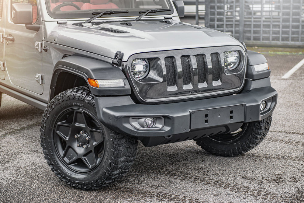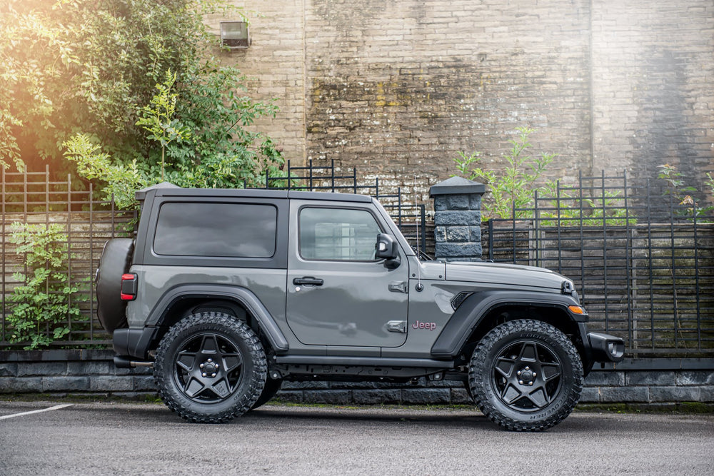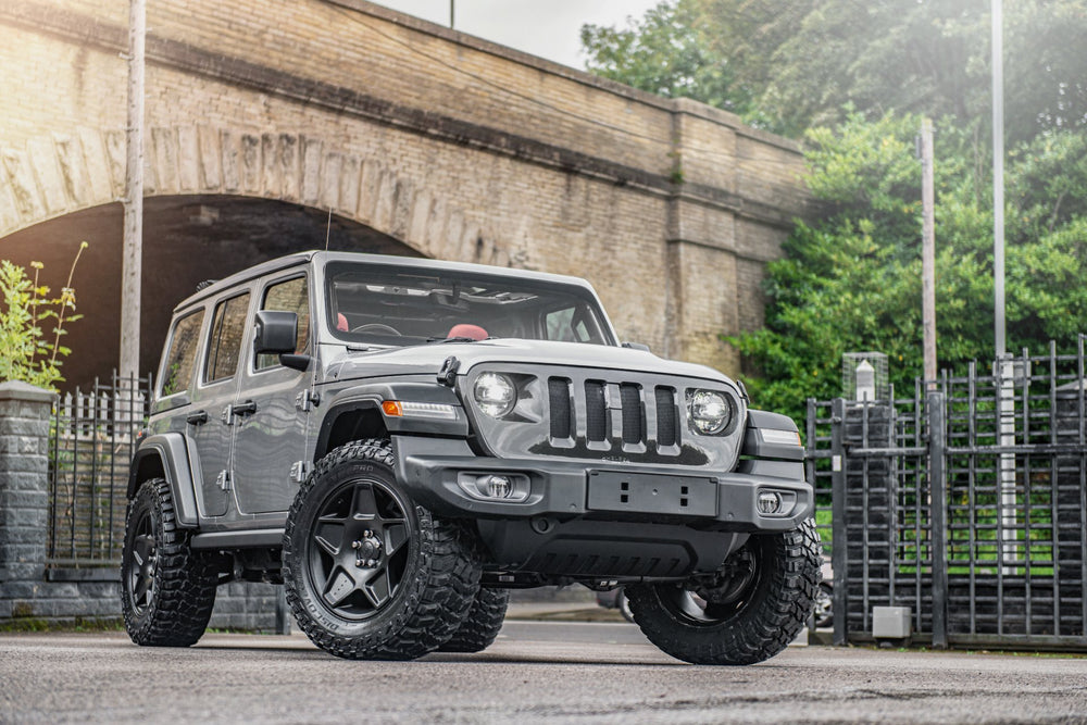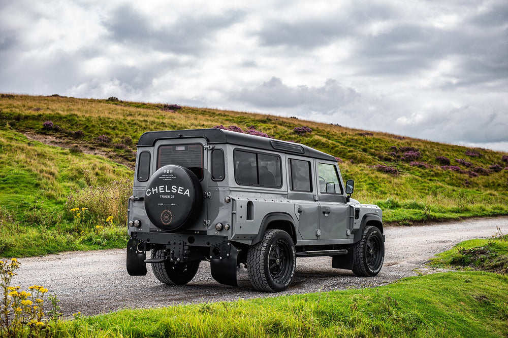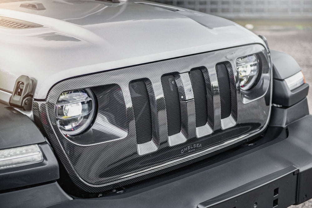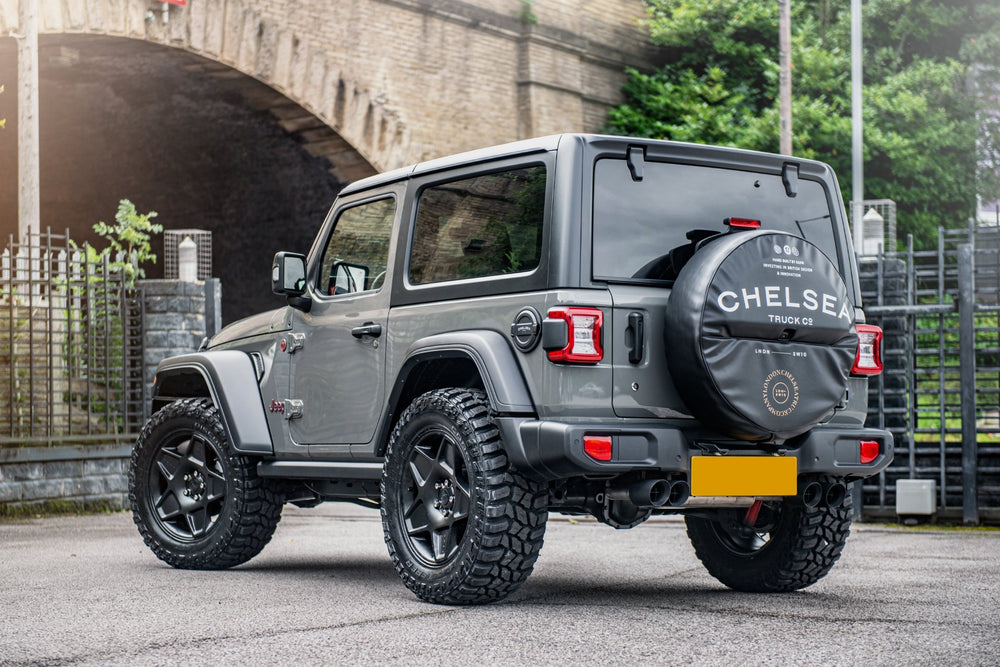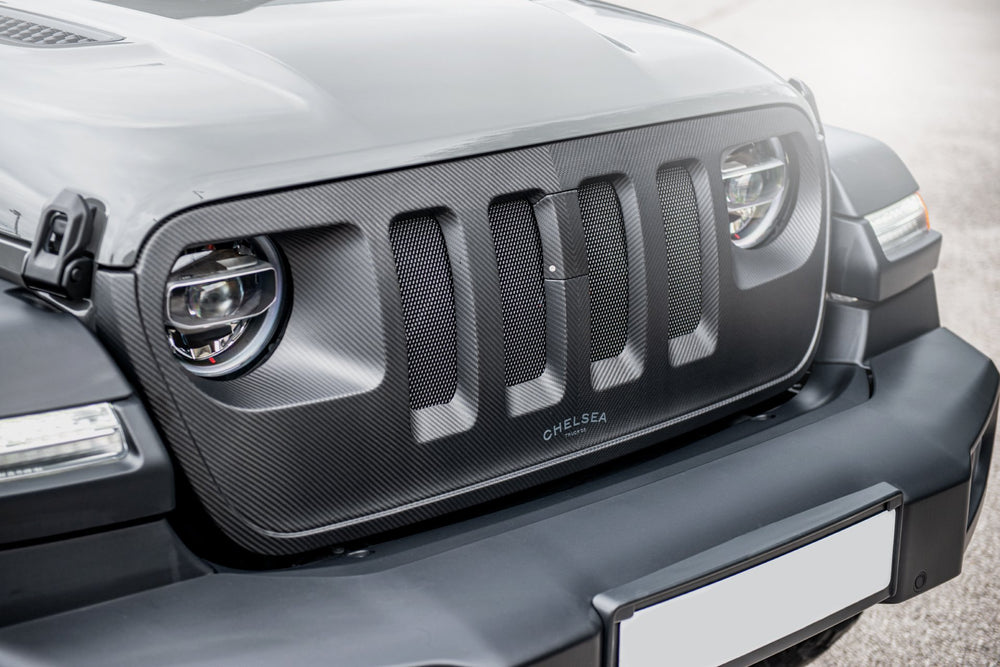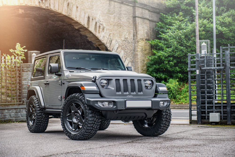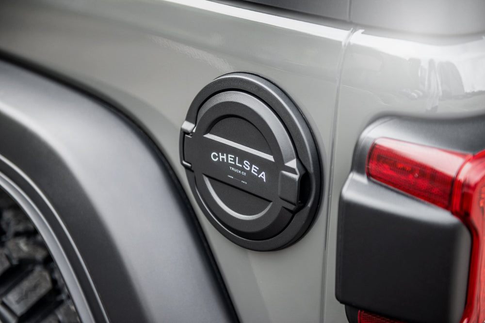 The ultimate in everlasting design, the Chelsea Truck Company Jeep Wrangler is displayed in a beautiful Nardo grey color scheme with contrasting black wheels, grille, and fuel filler cap.