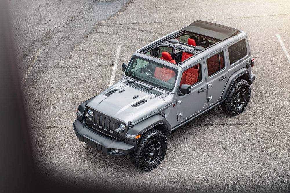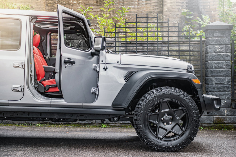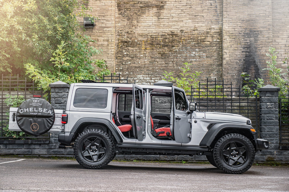 Bask in the beauty of the sting grey clear coat exterior of the Chelsea Truck Company Jeep Wrangler, this is paired with the distinctive red interior.